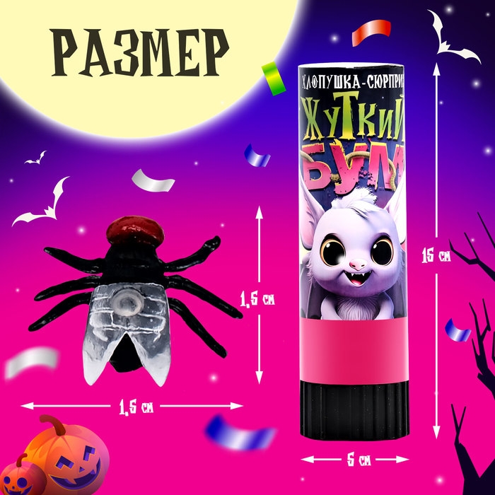 Хлопушка-сюрприз «Жуткий бум» — это идеальный атрибут для создания пугающей атмосферы на вечеринке по случаю Хэллоуина. Изделие размером 5 × 15 см наполнено цветной фольгой и маленькими мухами размером 1,5 × 1,5 см. Лёгкий и безопасный механизм активации позволяет использовать хлопушку в помещении и на улице.
