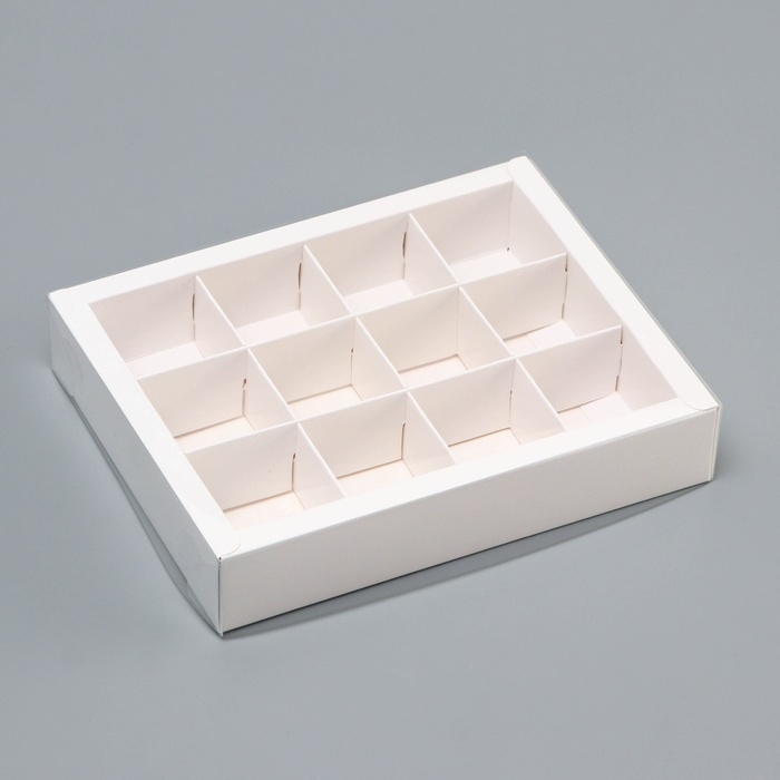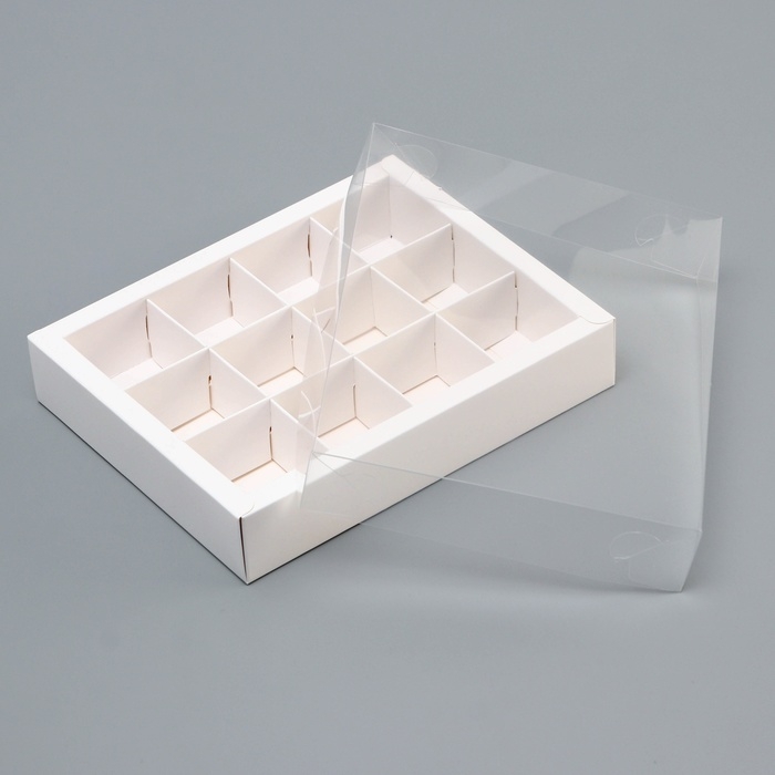 Коробка для 12 конфет размером 19 х 15 х 3,5 см с прозрачной крышкой — идеальное решение для стильной и эффектной упаковки.