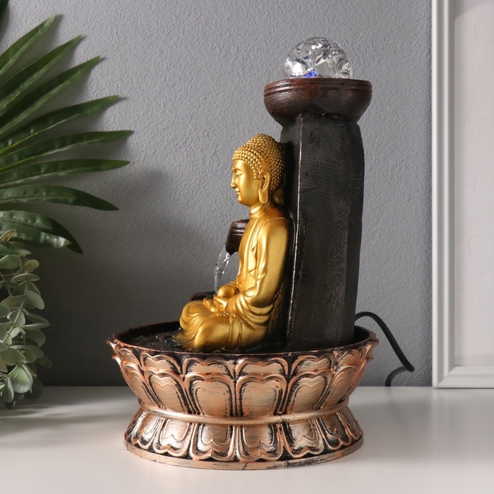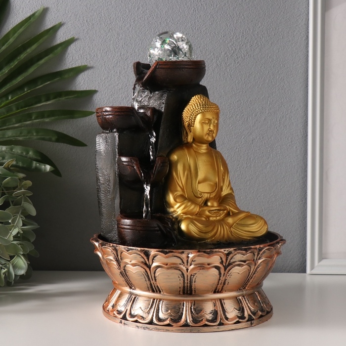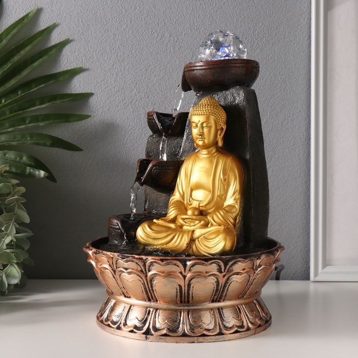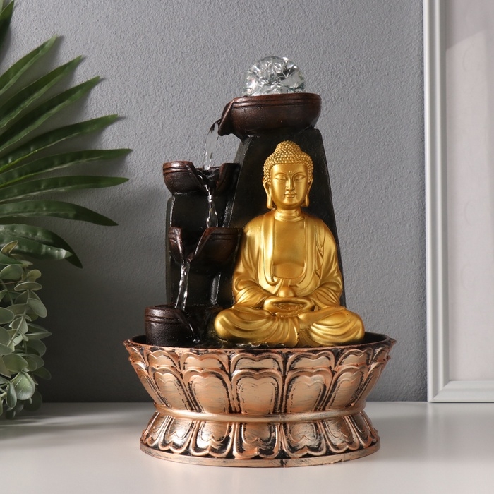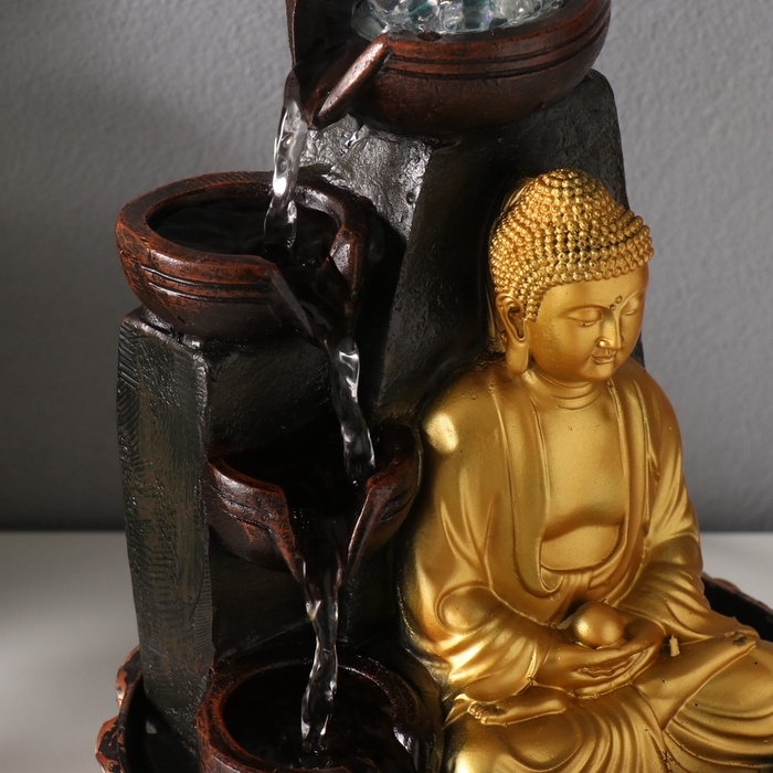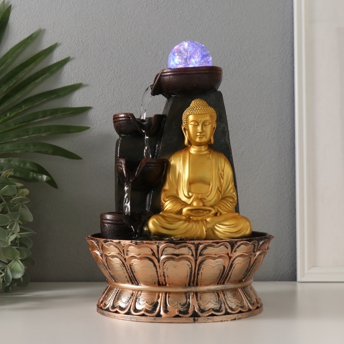 Фонтан настольный от сети, подсветка "Будда у скалы с чашами" золото 20х20х30 см