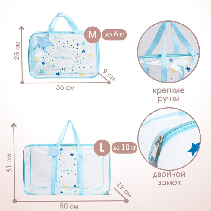 Сумка в роддом с косметичкой «Звёзды», набор 2 шт., 50х31/36х25, цвет прозрачный/голубой, Mum&Baby