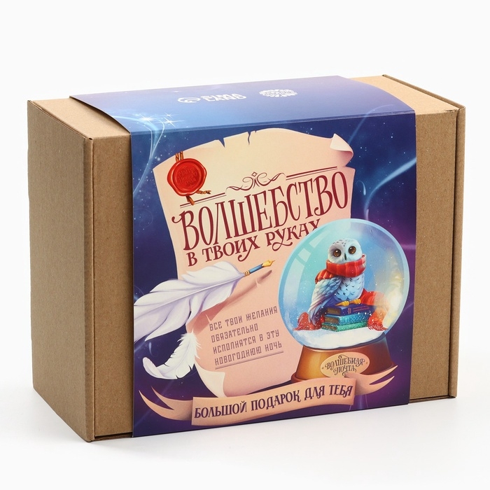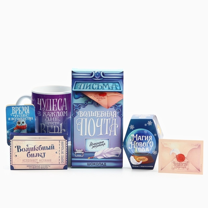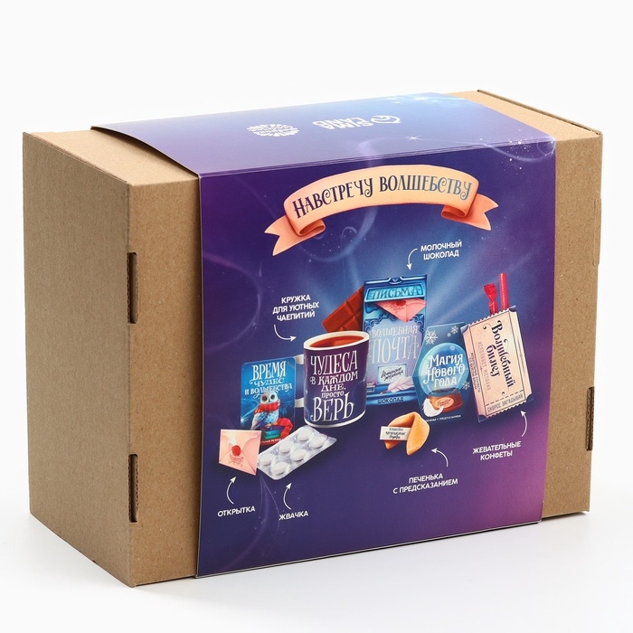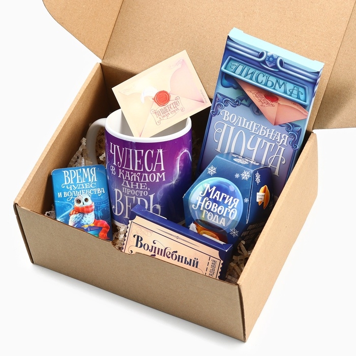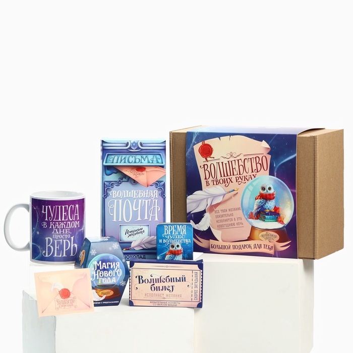 Подарочный набор новогодний, большой гифтбокс «Волшебство в твоих руках», жевательная конфета, молочный шоколад, кружка, печенье с предсказанием, жевательная резинка.