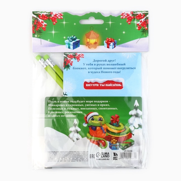 Подарочный набор новогодний, блокнот, карандаши ч/г 2 шт и восковые мелки «Новогодняя змейка»