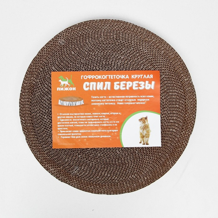 Она выполнена из гофрокартона, который изготовлен из природного материала - древесины и по своим свойствам очень на нее похож, чем и привлекают наших питомцев. Он достаточно плотен, чтобы выдержат острые коготки, и оптимально податлив, чтобы привлекать кошку.