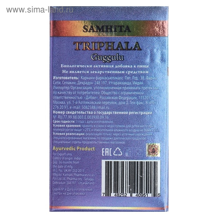 Состав: Основной составляющей данного препарата является чудодейственная трава миробалан хебула, или харитаки. Ее называют “королевой всех лекарств” и “растением, крадущим все болезни”, по мнению практиков аюрведы, прием этого компонента способен избавить от ста болезненных недугов. Кроме этого, в состав Трифала гуггул входят эмблика лекарственная, именуемая также Амлой, мироболан белерический, или Бибхитаки, перец длинный и, собственно, Гугул, или коммифора. Последний компонент – это растительная смола, обладающая невероятно сильными очищающими свойствами, она может избавить ваш организм от токсинов и шлаков лучше других подобных средств.