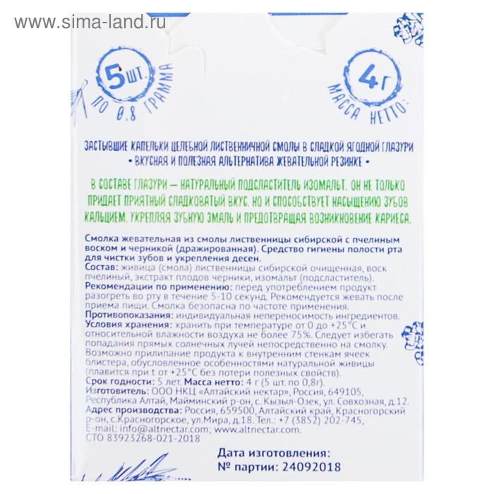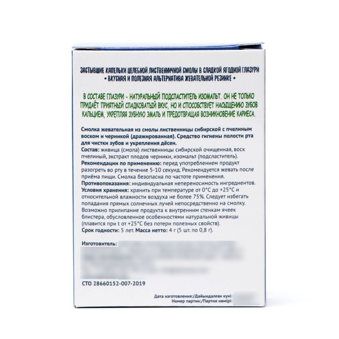 Смолка «Живица сибирская» — это природная жевательная резинка. Она появляется на свет в сибирской тайге в виде множества застывших капелек лиственничной смолы. Их бережно собирают, соединяют с полезным пчелиным воском и покрывают нежной ягодной глазурью на основе натурального подсластителя изомальта.