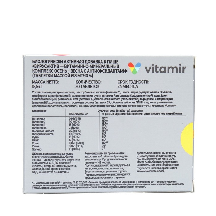 «Вирусактив — витаминно-минеральный комплекс осень-весна» это БАД к пище, рекомендуемая в качестве дополнительного источника витаминов А, С, Е, В6, фолиевой кислоты, янтарной кислоты, рутина, железа, цинка, хрома и селена.