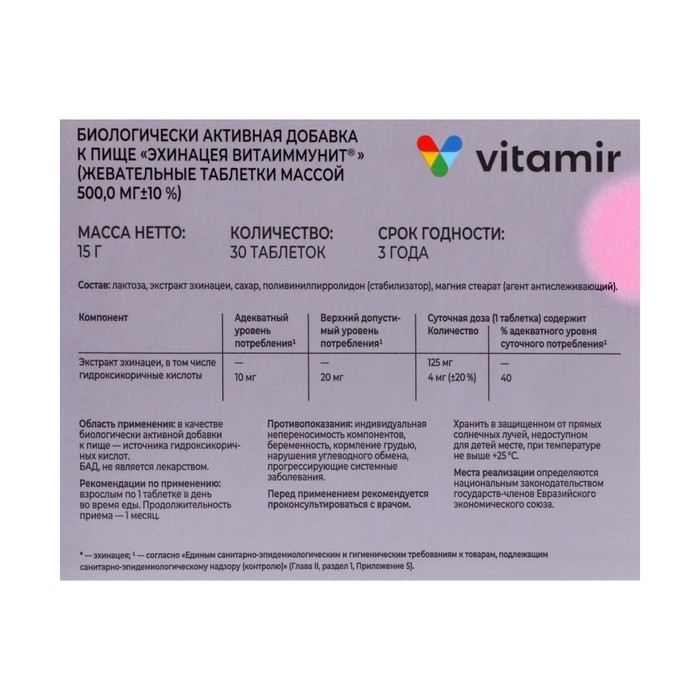 «Эхинацея Витаиммунит®» - вся сила природы для поддержания работы иммунной системы. Экстракт эхинацеи имеет очень богатый состав. Основными веществами в нем являются гидроксикоричные кислоты и полисахариды, которые способствуют запуску процессов, увеличивающих количество лейкоцитов (белых клеток крови, являющихся важной составляющей иммунной системы) и повышающих их активность. Кроме того, положительное влияние эхинацеи на иммунитет проявляется в сдерживании активности ферментов, участвующих в возникновении воспалительных процессов. Данный экстракт поможет уменьшить вероятность возникновения осложнений после простуды и снизить риск ее повторного возникновения. Таким образом, экстракт эхинацеи способствует повышению естественных защитных сил организма и сопротивляемости вирусным инфекциям.