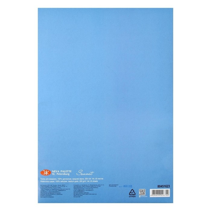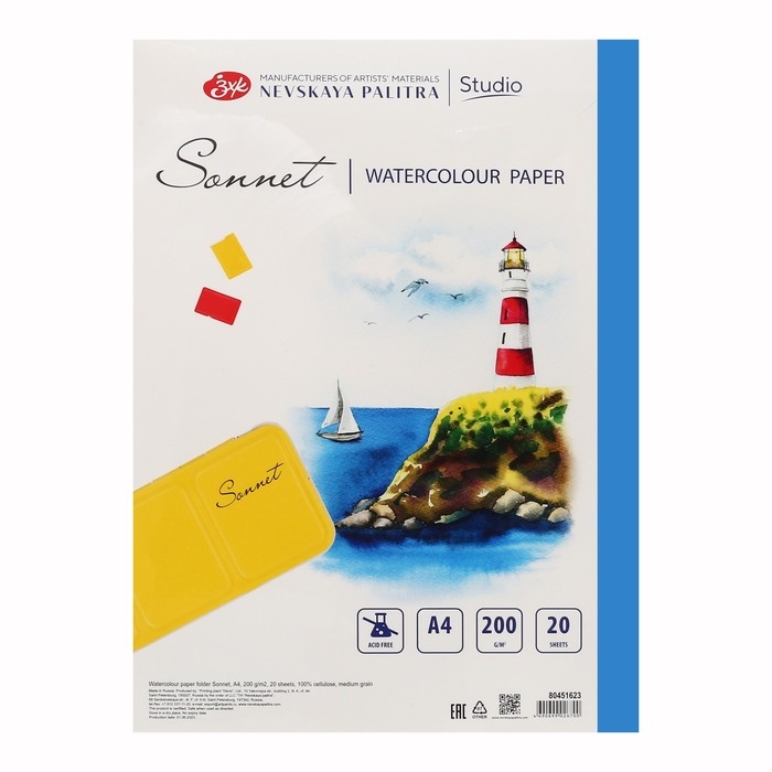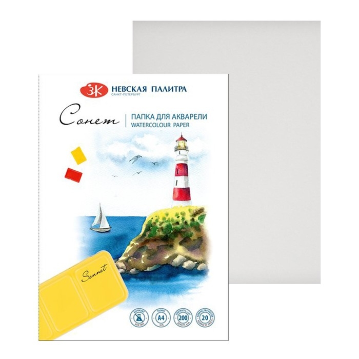 Акварельная бумага "Сонет", среднее зерно, формат А4, 20 листов. Предназначена для работы с красками на водной основе (акварель, гуашь, акрил) и смешанных техник. Благодаря составу из 100% целлюлозы, бумага идеальна для создания лессировок и многослойной живописи, сохраняет цвета яркими, отлично выдерживает смывки, корректировки, устойчива к деформации даже при сильном намокании. Для удобства переноски и хранения листы бумаги упакованы в папку из плотного картона.