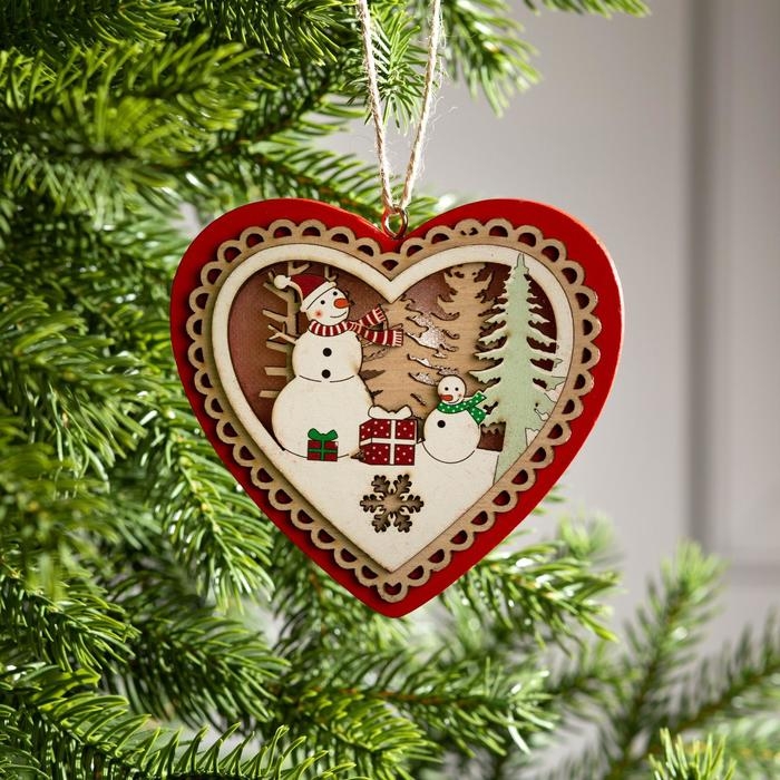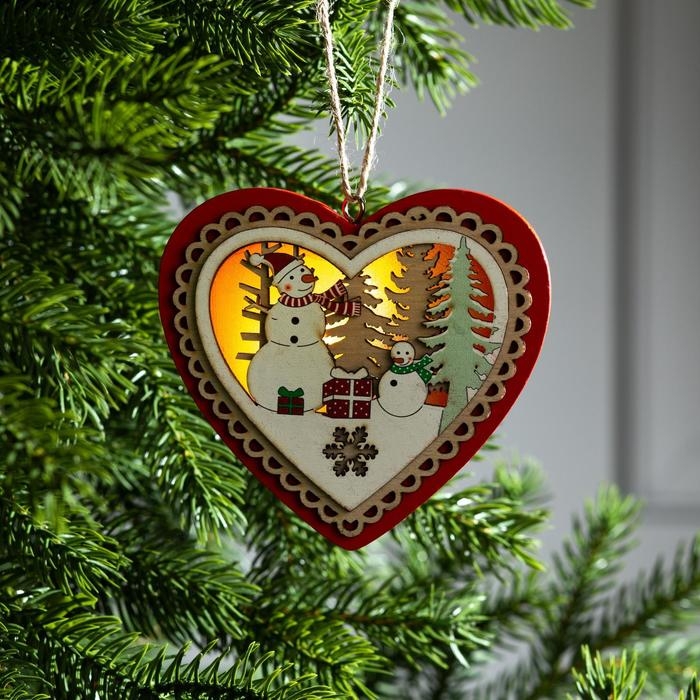 Ёлочная игрушка «Красное сердце со снеговиком», от батареек, свечение тёплое белое