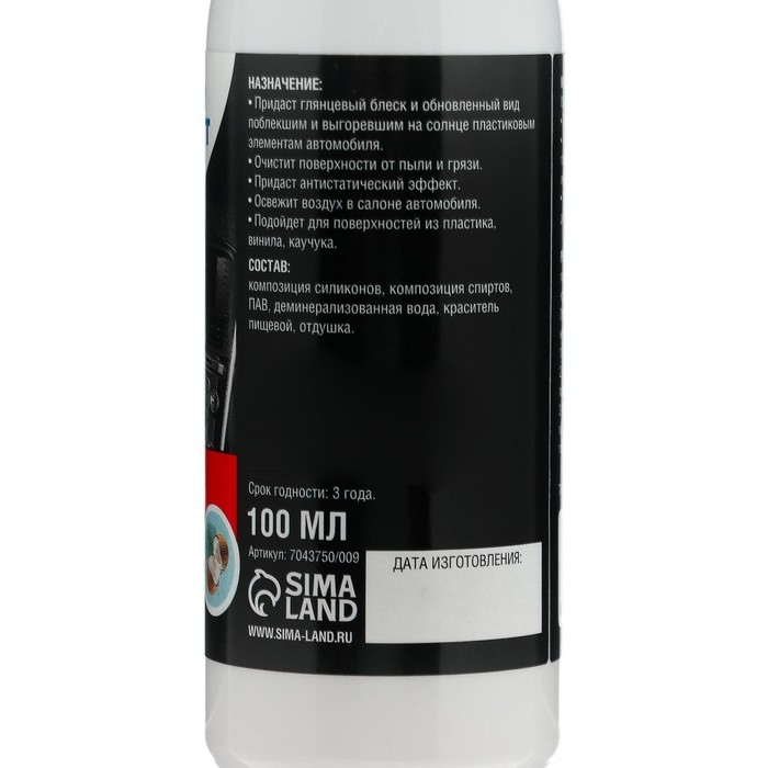 - Придаст глянцевый блеск и обновлённый вид поблекшим и выгоревшим на солнце пластиковым элементам автомобиля.