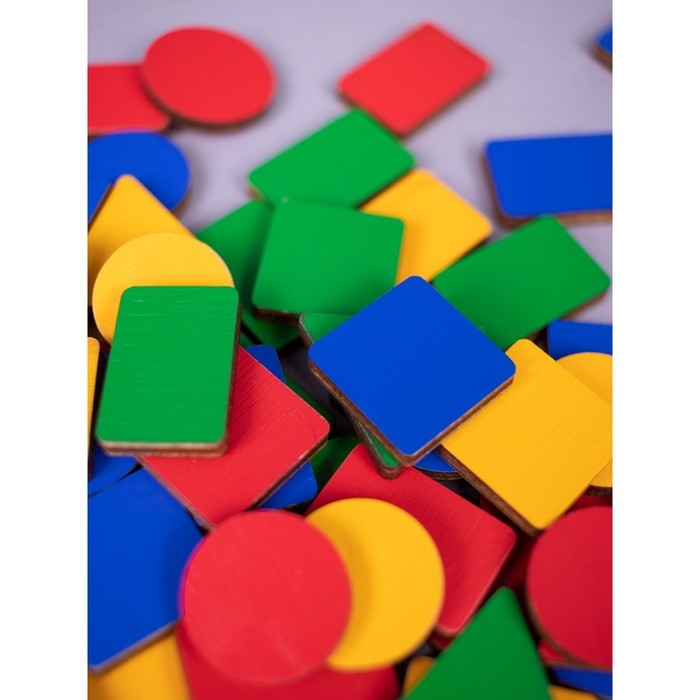 Дополнительный набор цветных деталей для «Умного Сундучка» представляет собой 80 гладких и приятных на ощупь фишек, окрашенных с двух сторон. В наборе содержатся 4 вида геометрических фигур: квадраты, треугольники, круги и прямоугольники.
