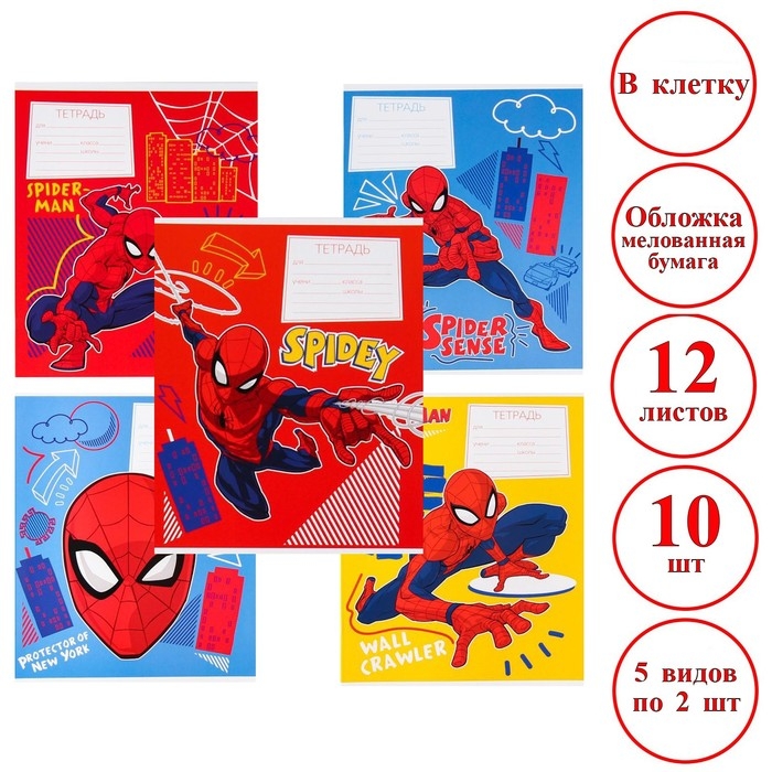 Набор тетрадей 10 штук, 12 листов, в клетку, обложка бумага мелованная, Человек-паук