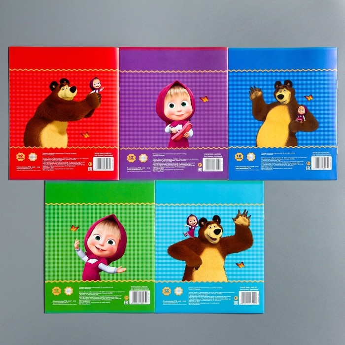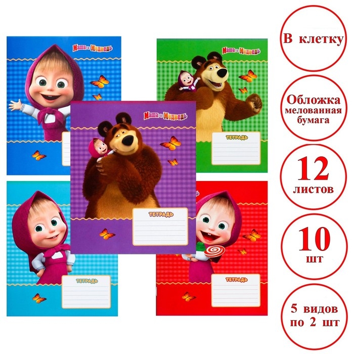 Набор тетрадей 10 штук, 12 листов, в клетку, обложка мелованная бумага, Маша и Медведь