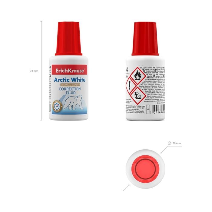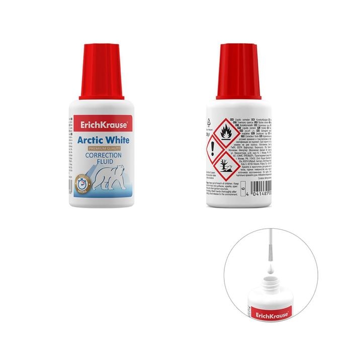 Корректирующая жидкость 20 мл, ErichKrause Arctic White, быстросохнущая, повышенной белизны, на основе растворителя, с кисточкой