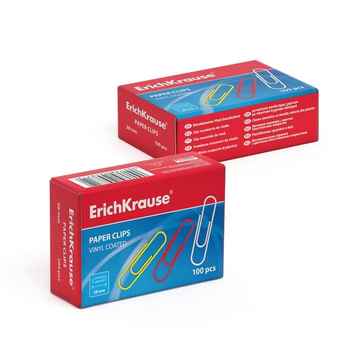 Скрепки канцелярские 28 мм, 100 штук, ErichKrause, цветные с виниловым покрытием, картонная упаковка, МИКС