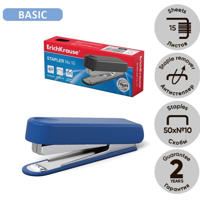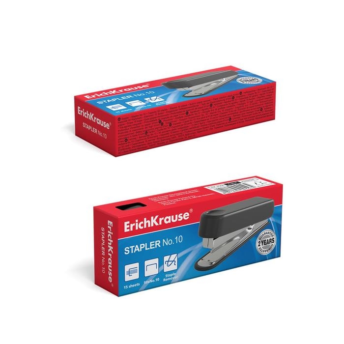 Степлер ErichKrause № 10, до 15 листов, встроенный антистеплер, вмещает до 50 скоб, глубина закладки бумаги до 51 мм, микс