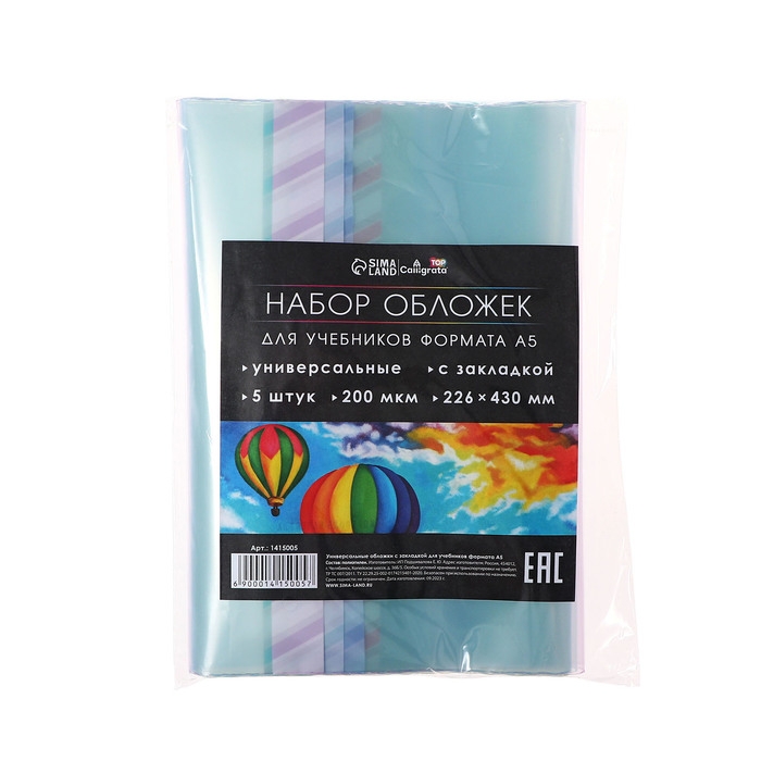Набор обложек ПЭ 5 штук, 226 х 430 мм, 200 мкм, для учебников формата А5, универсальная, с закладкой