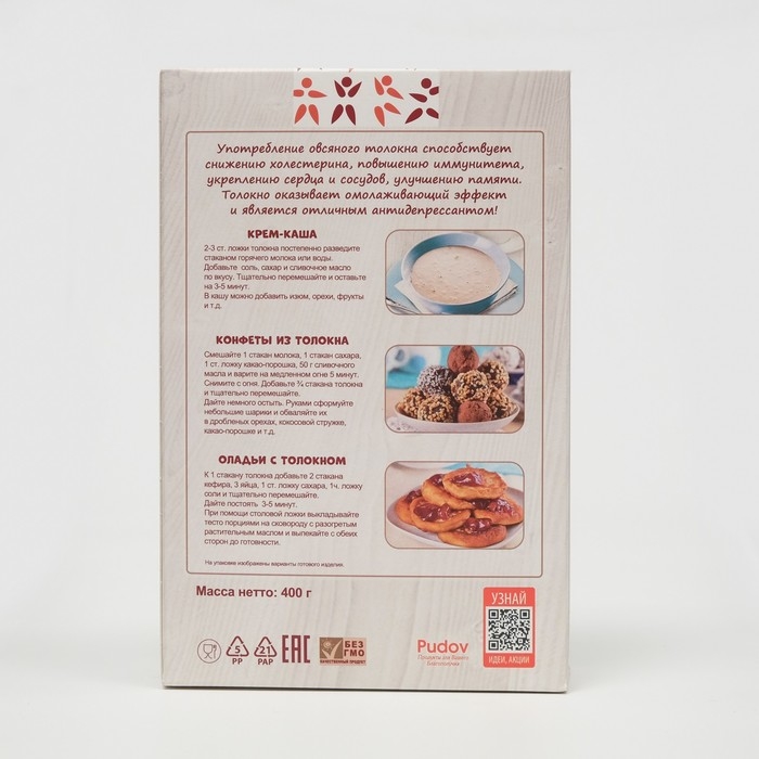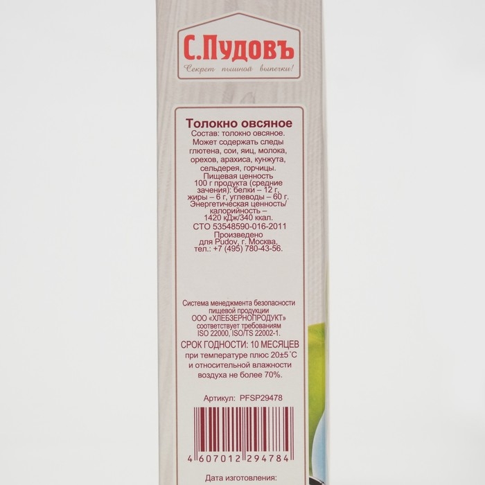 Овсяное толокно «С. Пудовъ»— мука из известных и полезных зерновых культур (овёс, ячмень и другие). Для его изготовления зёрна пропаривают, высушивают, обжаривают, очищают и толкут. Благодаря такой объёмной и масштабной технологии производства в готовом продукте сохраняются отдельные фракции зерна, нежели при традиционном помоле.