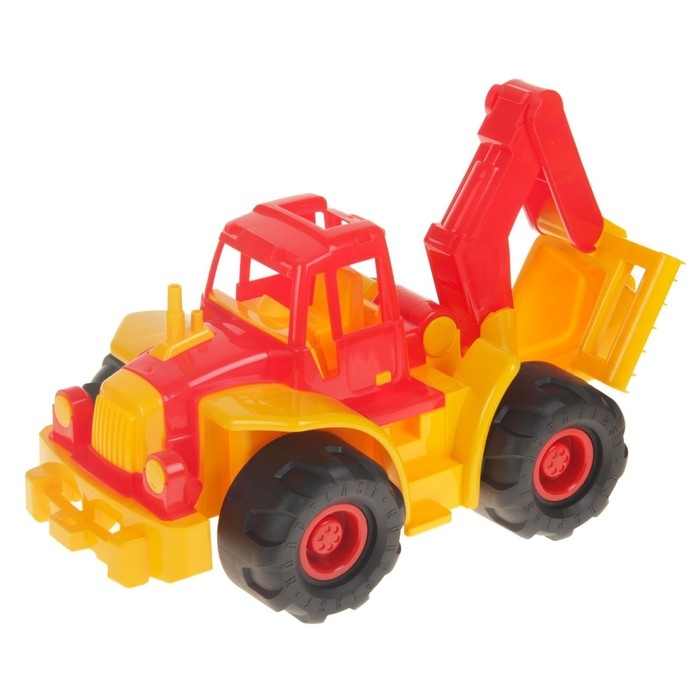 Трактор-погрузчик — незаменимая техника на любой ферме и стройке. Она оснащена широким ковшом с удобной ручкой для копания песка и мелких камушков. Такая игрушка подойдёт для развлечений дома и на улице.