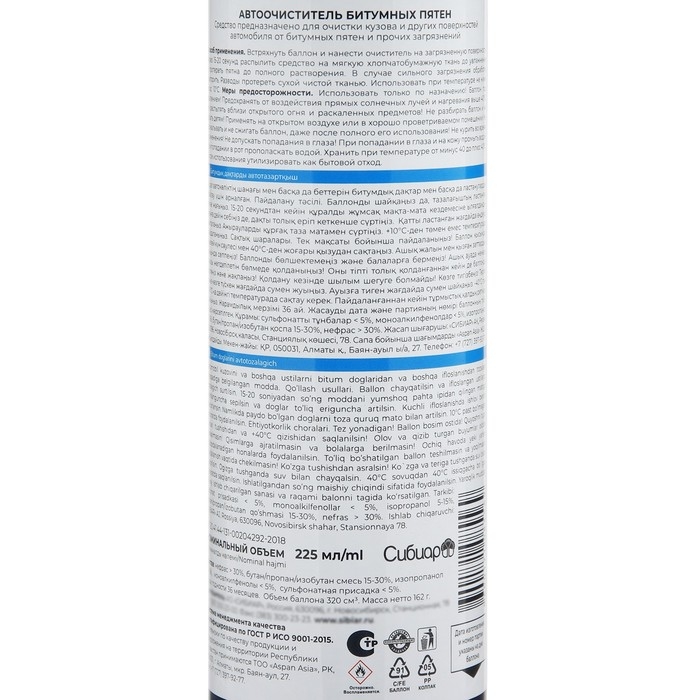 Средство предназначено для очистки кузова и других поверхностей автомобиля от битумных пятен и прочих загрязнений.