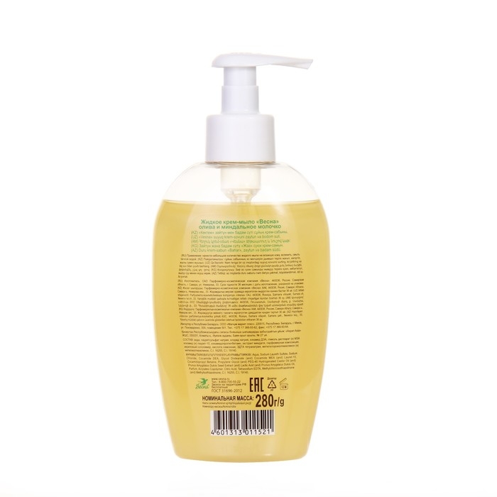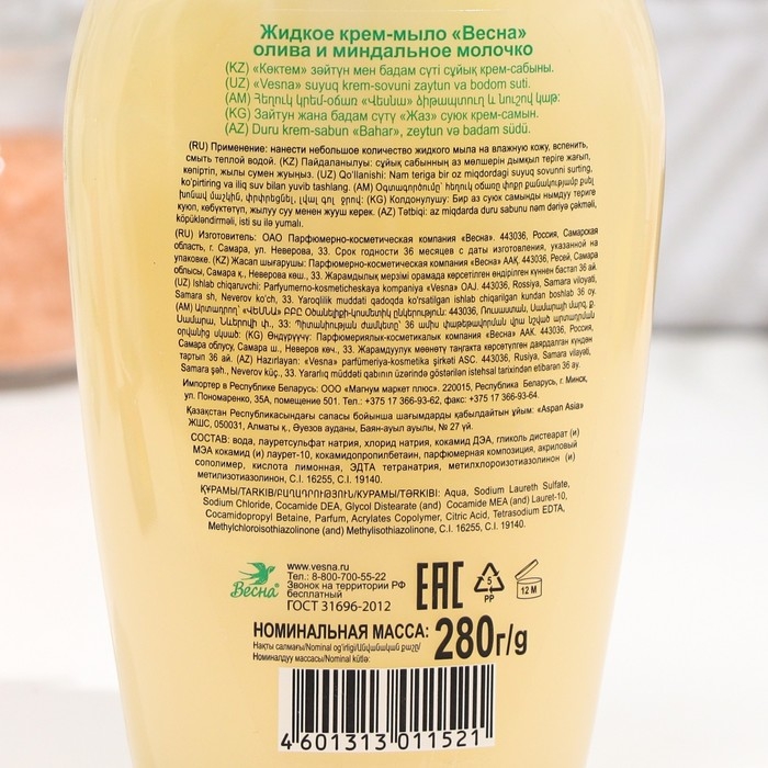 Крем-мыло жидкое Олива Миндальное молочко экономичный вариант жидкого семейного крем-мыла. Жидкое крем-мыло это здоровье Вашей кожи. Жидкое крем-мыло не сушит кожу, бережно очищает ее и идеально подходит для всей семьи. Крем-мыло подходит для повседневного использования. Крем-мыло Весна Олива и миндальное молочко очищает, хорошо пенится, быстро смывается. Крем-мыло обладает антисептическими свойствами.