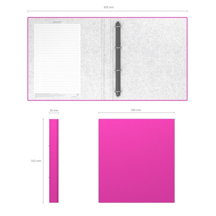 Папка - регистратор формата А4 снабжена механизмом на O-кольцах диаметром 25 мм. Изготовлена из картона толщиной 1,75 мм, покрытого бумагой со структурным тиснением и водоотталкивающей поверхностью. Корешок шириной 35 мм. Вместительность до 250 листов бумаги плотности 80 г/м². На форзаце есть шаблон для оглавления. Удобна для проведения презентаций, представления документации на семинарах. Коллекция представлена в ярких неоновых цветах.