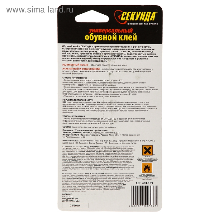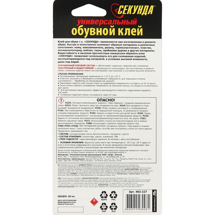 Клей "Секунда" применяется при изготовлении и ремонте обуви, быстро и качественно склеивает обувные материалы в различных сочетаниях: кожу, кожзаменитель, резину, термоэластопласт, пластик, поливинилхлорид, войлок, ткани, пробковое дерево и другого. Удлиненный носик облегчает процесс нанесения клея. Склеенное изделие можно эксплуатировать под нагрузкой и в условиях высокой влажности.