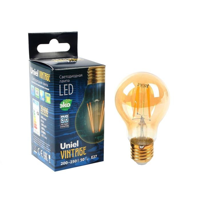 Лампа светодиодная Uniel Vintage, A60, А, E27, 6 Вт, 230 В, золотистая колба