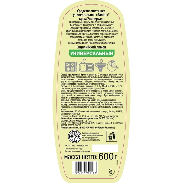 Средство универсальное Sanita, "Лимон", крем, 600 мл
