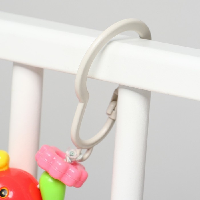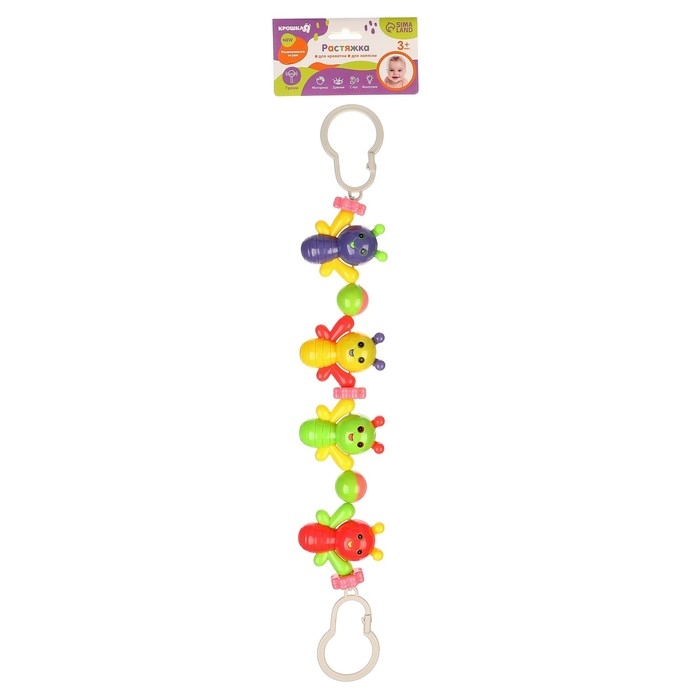 Яркая погремушка-растяжка оснащена удобными креплениями, которые подойдут практически для любого типа коляски, кроватки и даже автокресла.