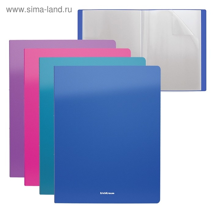 Папка файловая формата А4 из высококачественного пластика с глянцевой текстурой поверхности "диагональ", на которой не видно отпечатков пальцев и мелких царапин. Предназначена для хранения и просмотра документов. Папка содержит 40 прозрачных листов-карманов, надежно скрепленных сваркой. Цвет папки – ассорти: бирюзовый,синий, фиолетовый. Папка вмещает до 100 бумажных листов. Поставляется в различных вариантах цвета/дизайна без возможности выбора.