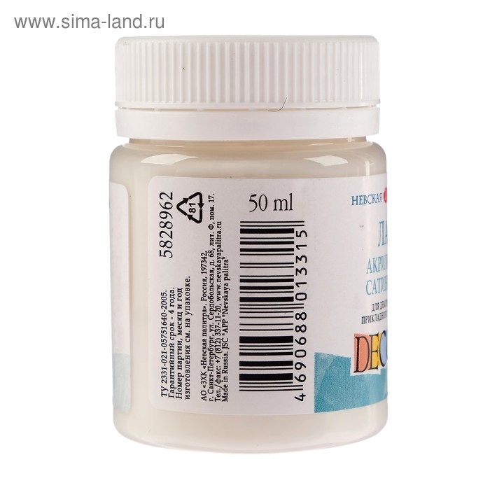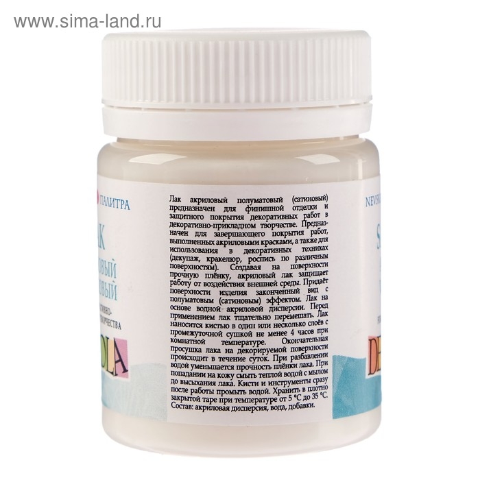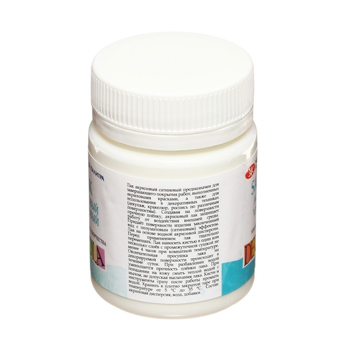 Лак акриловый полуматовый (сатиновый) предназначен для финишной отделки и защитного покрытия декоративных работ в декоративно-прикладном творчестве. Предназначен для завершающего покрытия работ, выполненных акриловыми красками, а также для использования в декоративных техниках (декупаж, кракелюр, роспись по различным поверхностям).