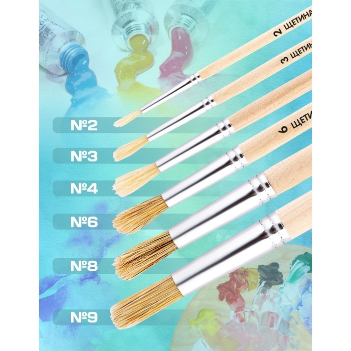 Набор кистей, щетина, плоские, 6 штук: № 1, 2, 3, 4, 5, 6, с деревянными ручками, на блистере