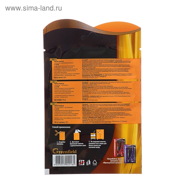Ароматизатор воздуха Гринфилд Parfum Francais. Этот освежитель воздуха в форме саше отлично пахнет, придает натуральную свежесть в жилом и офисном помещении, платяном и бельевом шкафах, ванных комнатах, санузлах, салонах автомобилей. Романтический аромат подойдет для любителей различных ароматов, ведь в нем таятся бесподобные ноты французских классических запахов. Этот аромат способен создавать хорошее настроение в Вашем доме.