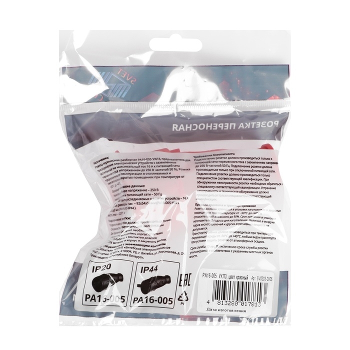 Розетка переносная 16-005, 16 А, 250 В, IP44, с з/к, с заглушкой, каучук, красная