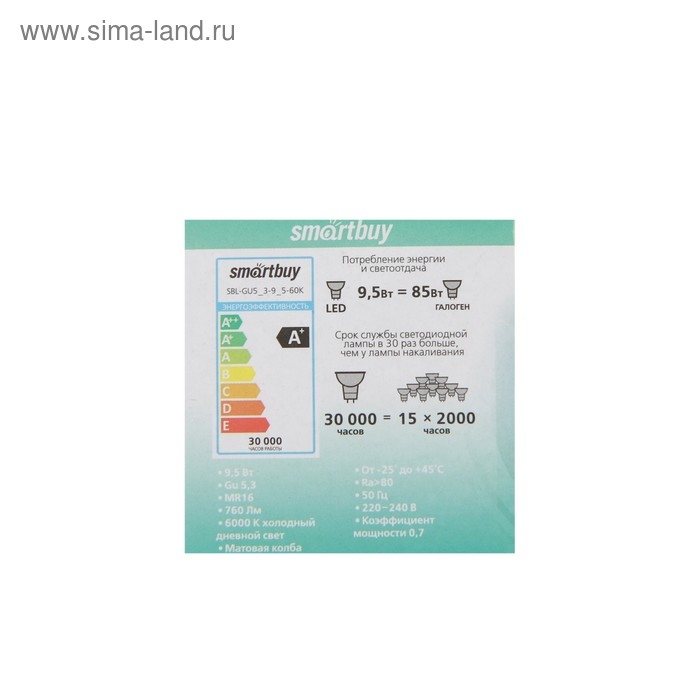 Лампа cветодиодная Smartbuy, GU5.3, 9.5 Вт, 6000 К, холодный белый свет