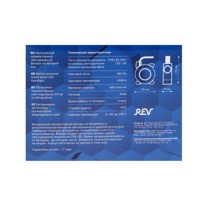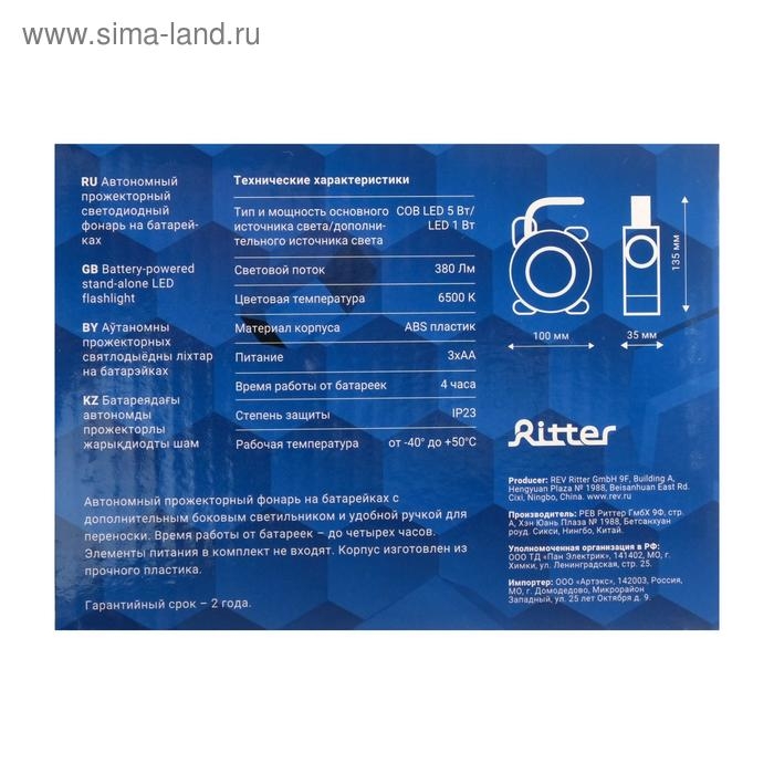 Прожектор светодиодный Ritter, 6 Вт, 380 Лм, IP23, автономный