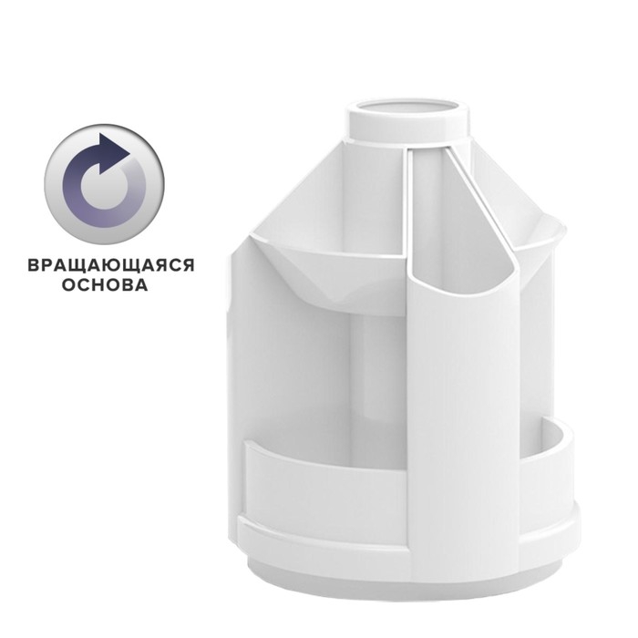 Подставка для удобного хранения настольных принадлежностей. Оснащена вращающимся механизмом и изготовлена из высококачественного пластика.