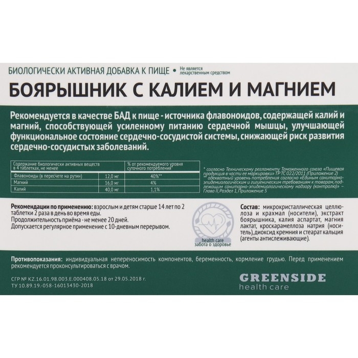 Допускается регулярное применение с 10-дневным перерывом**Состав:** микрокристаллическая целлюлоза и крахмал (носители), экстракт боярышника, калия аспартат, магния лактат, кроскарамеллоза натрия (носитель), диоксид кремния и стеарат кальция (агенты антислеживающие).