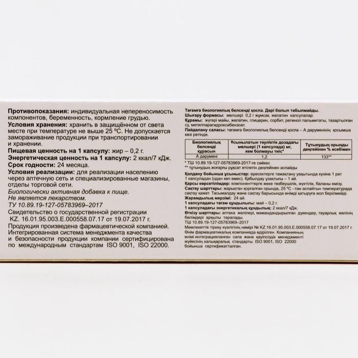 Назначение: в качестве биологически активной добавки к пище – дополнительного источника витамина А.