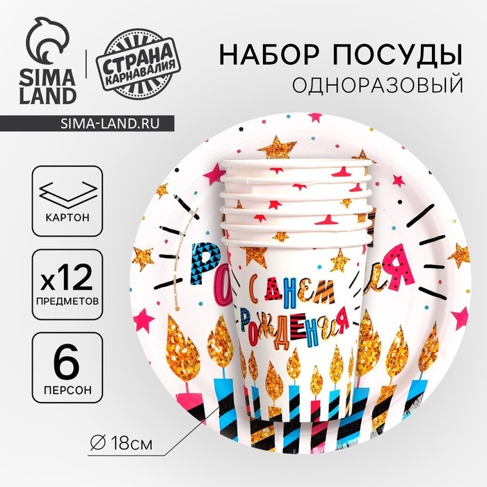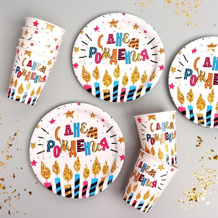 Представьте себе праздничный стол, украшенный яркой посудой с праздничным декором! Весь набор выполнен в красочном дизайне с изображением свечей, звезд и надписью "С днем рождения". Тарелки и стаканчики изготовлены из плотного картона, что гарантирует их прочность. После праздника вы просто выбросите ее, не тратя время на мытье. Этот набор идеально подойдет для праздничного застолья на день рождения, ведь он создаст атмосферу радости и веселья. Набор упакован в удобный пакет, что делает его идеальным вариантом для подарка.