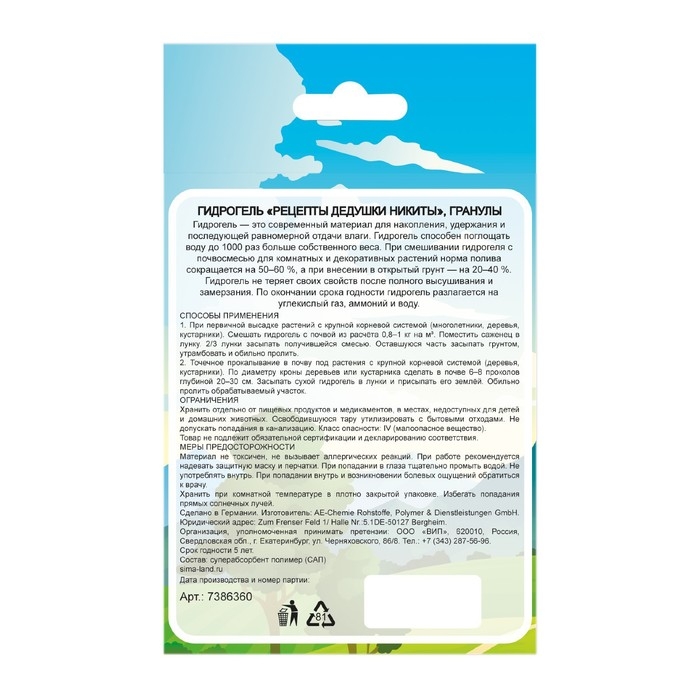 Гидрогель "Рецепты Дедушки Никиты", гранула, 20 г