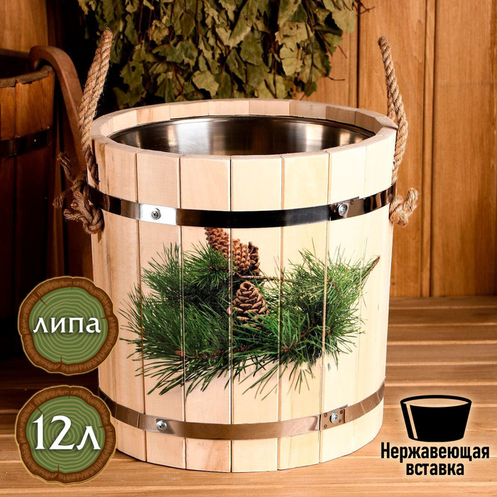 Запарник из липы, 12 л, нержавеющая вставка, нержавеющий обод, веревки, "Еловая ветка"