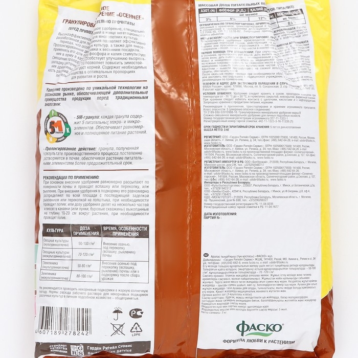 Удобрение сухое минеральное "Осень" Фаско 5М, гранулированное, 3 кг