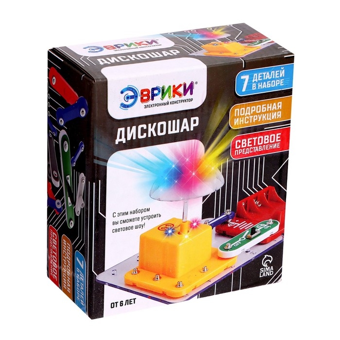 - Набор имеет красочную инструкцию: по ней ребёнок самостоятельно соберёт схему «Дискошар» и испытает её!