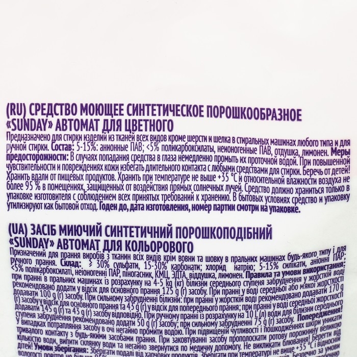 Стиральный порошок Sunday для автоматической стирки цветного белья весом 15 кг представляет собой эффективное средство, специально разработанное для удаления загрязнений и заботы о цветных тканях в автоматических стиральных машинах. Вот основные характеристики этого продукта:
