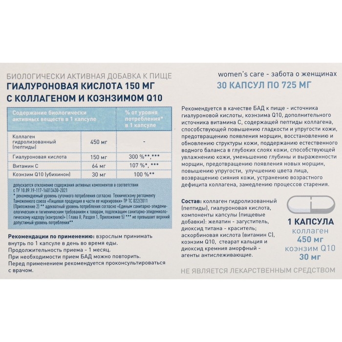 Гиалуроновая кислота 150 мг с коллагеном и коэнзимом Q 10, 30 капсул, 725 мг