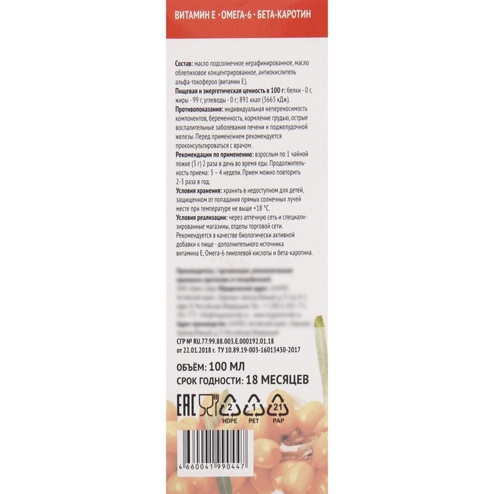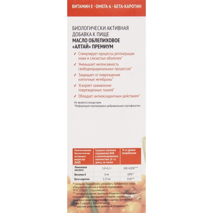 Облепиховое масло АЛТАЙ «Премиум» 25мг%, пэт, 100 мл