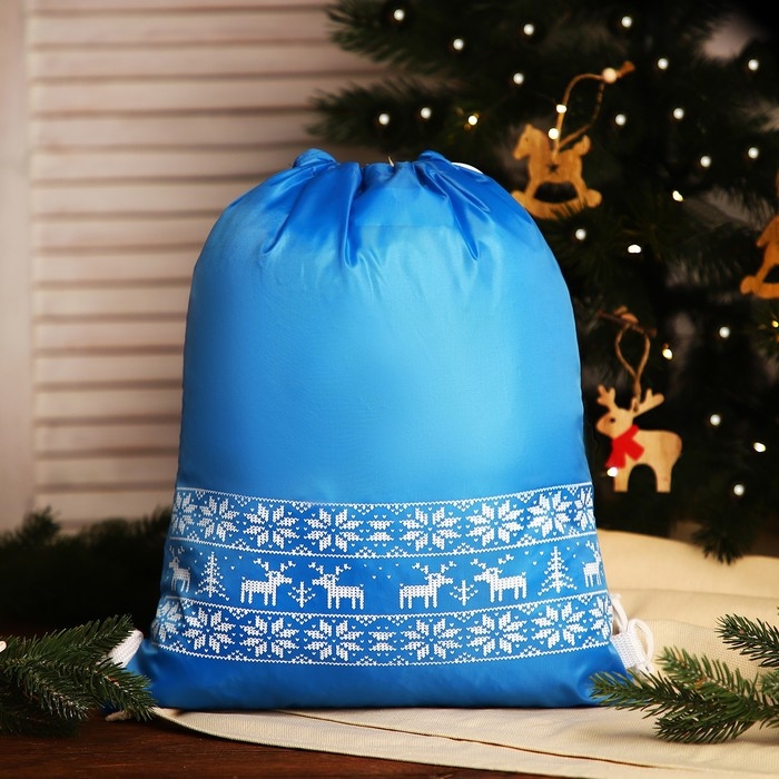 Новый год 2025. Новогодний мешок для подарков на шнурке "Олени", цвет голубой