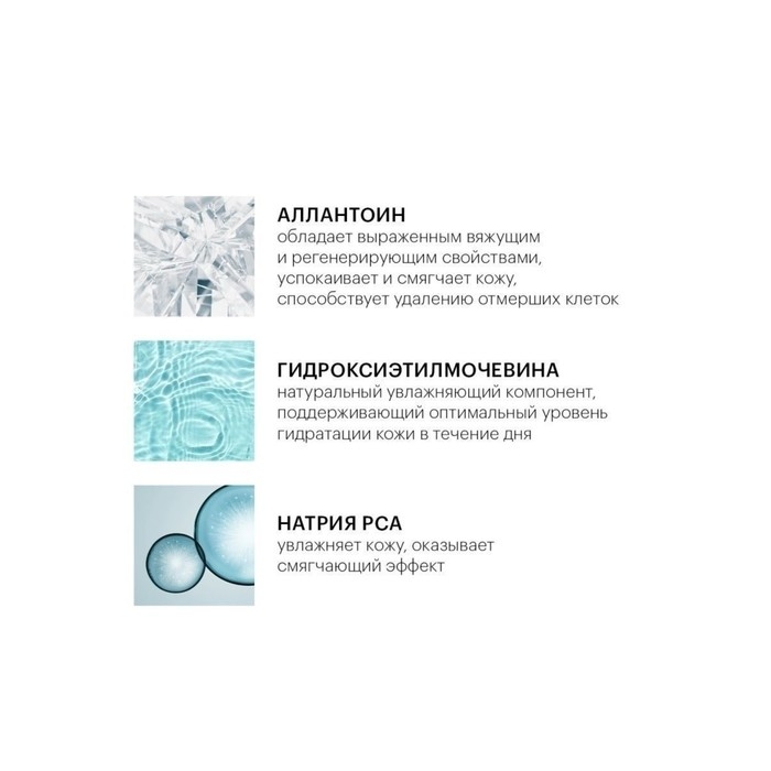 Аллантоин - содержится в корнях окопника, соевых бобах, рисовой шелухе и проростках пшеницы. Обладает выраженным вяжущим и регенерирующим свойствами, успокаивает и смягчает кожу, способствует удалению отмерших клеток, сужает поры.